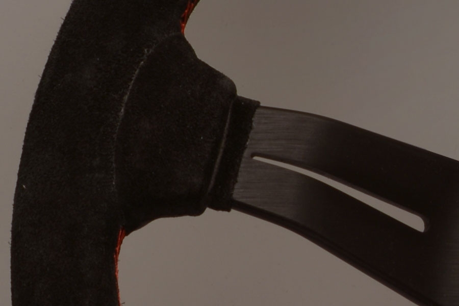 Features: Black suede leather/red stitching/black spokes/horn button with Nardi logo.