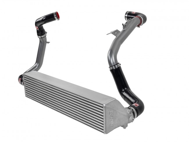 Our 3.5-inch, 100% aluminum intercooler is 30% larger than stock, flowing a higher volume of air and acting better as a heat sink to reduce intake air temperatures versus the stock 2.5-inch intercooler. The included 2.25-inch aluminum tubing further increases air flow and aids in temperature reduction due to better heat dissipation versus the stock plastic.